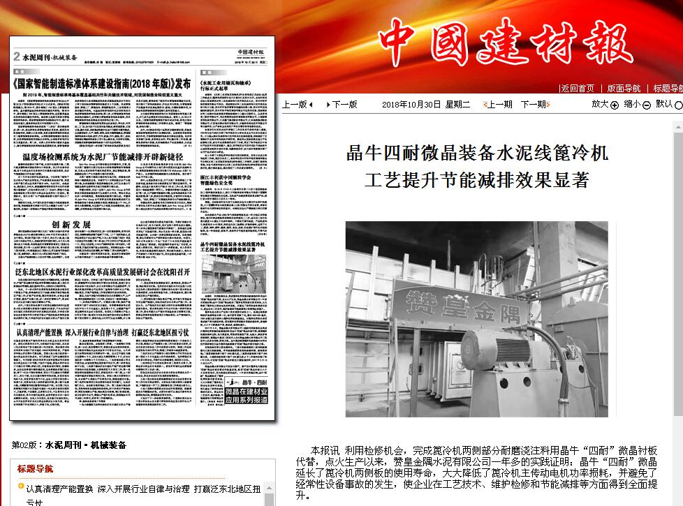 本报讯 利用检修机会,完成篦冷机两侧部分耐磨浇注料用晶牛“四耐”微晶衬板代替,点火生产以来,赞皇金隅水泥有限公司一年多的实践证明:晶牛“四耐”微晶延长了篦冷机两侧板的使用寿命,大大降低了篦冷机主传动电机功率损耗,并避免了经常性设备事故的发生,使企业在工艺技术、维护检修和节能减排等方面得到全面提升。